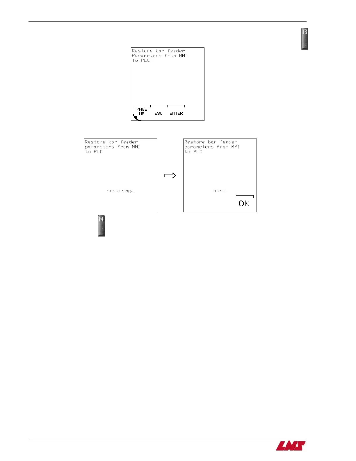 Step 10: Press F4 (PAGE DOWN) until Restore Bar Feeder Parameters from MMI to PLC screen is displayed. Press F3 (ENTER).