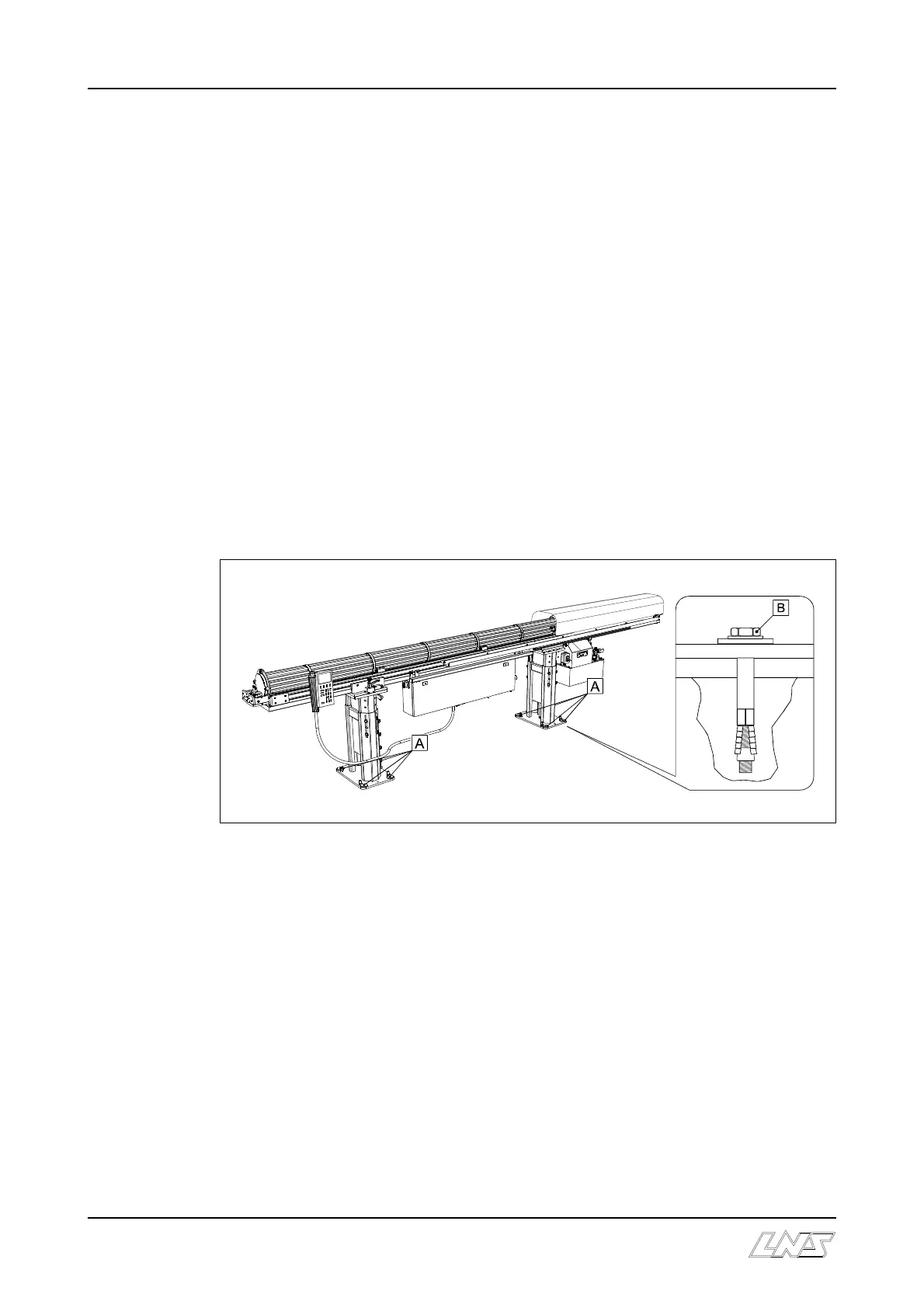 Adjusting the screws (B), set the lateral level of the bar feed system.
