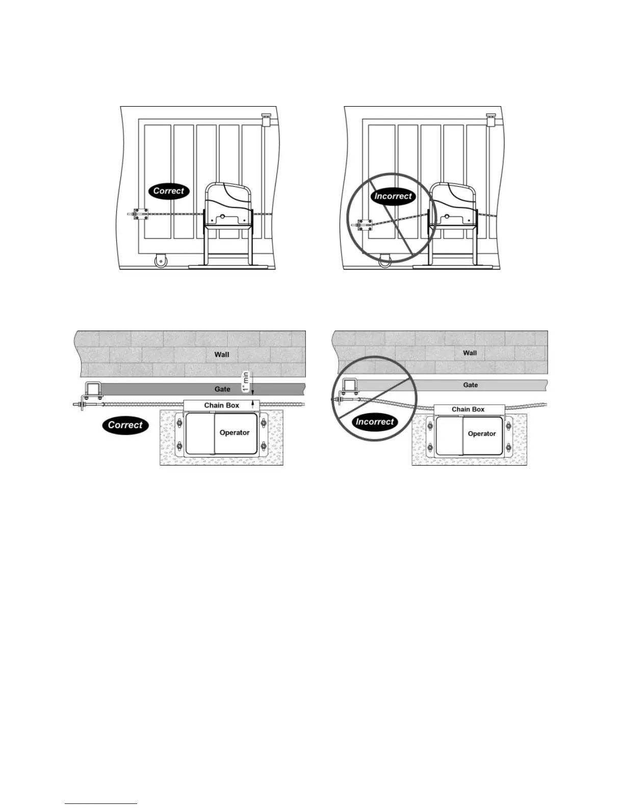 3). Make sure there is 1” distance at least between the chain box and the gate after you position the base