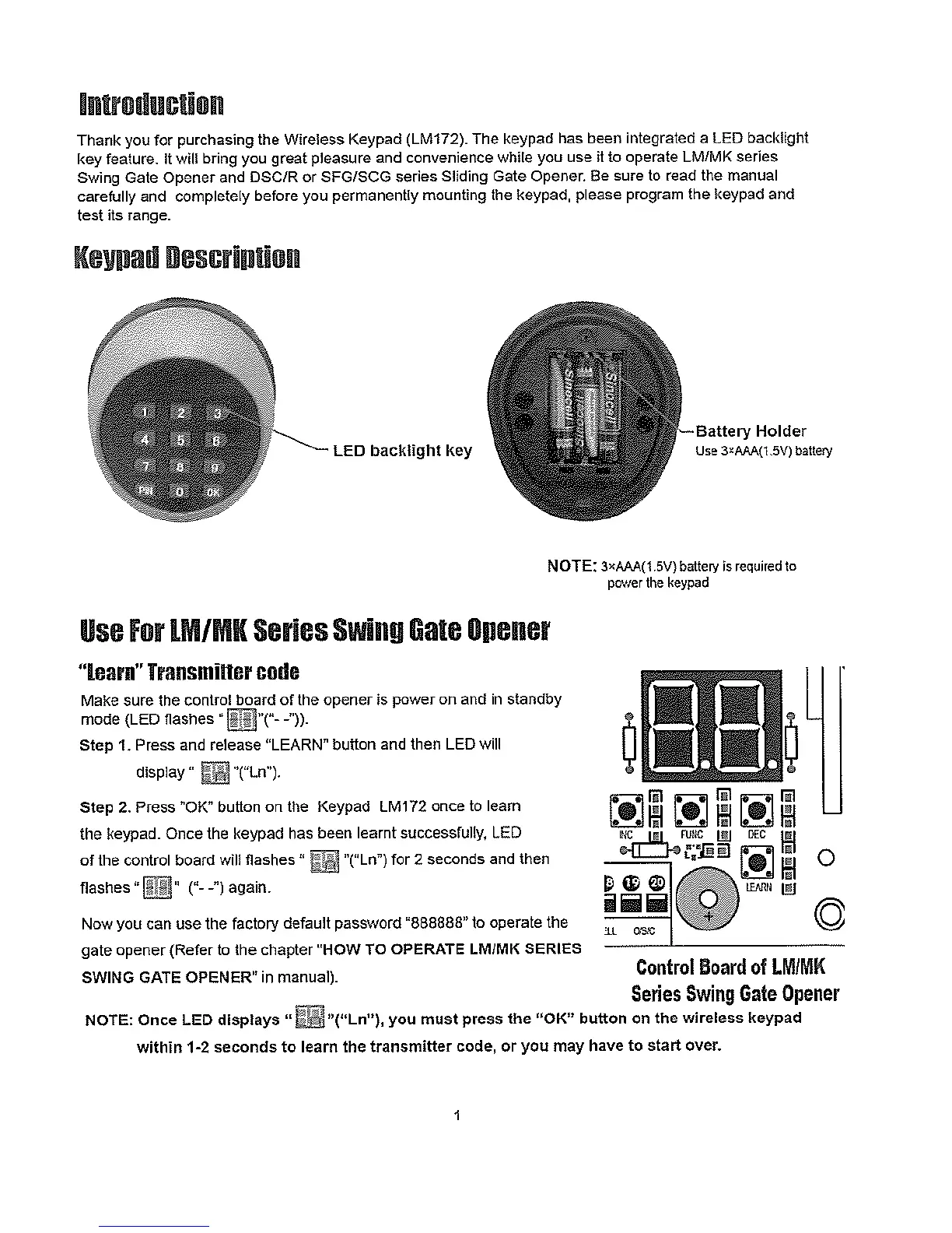 LockMaster LM172 - LM;MK Series Swing Gate Opener Operations; Learn Transmitter Code; Keypad Features and Maintenance; Keypad Description