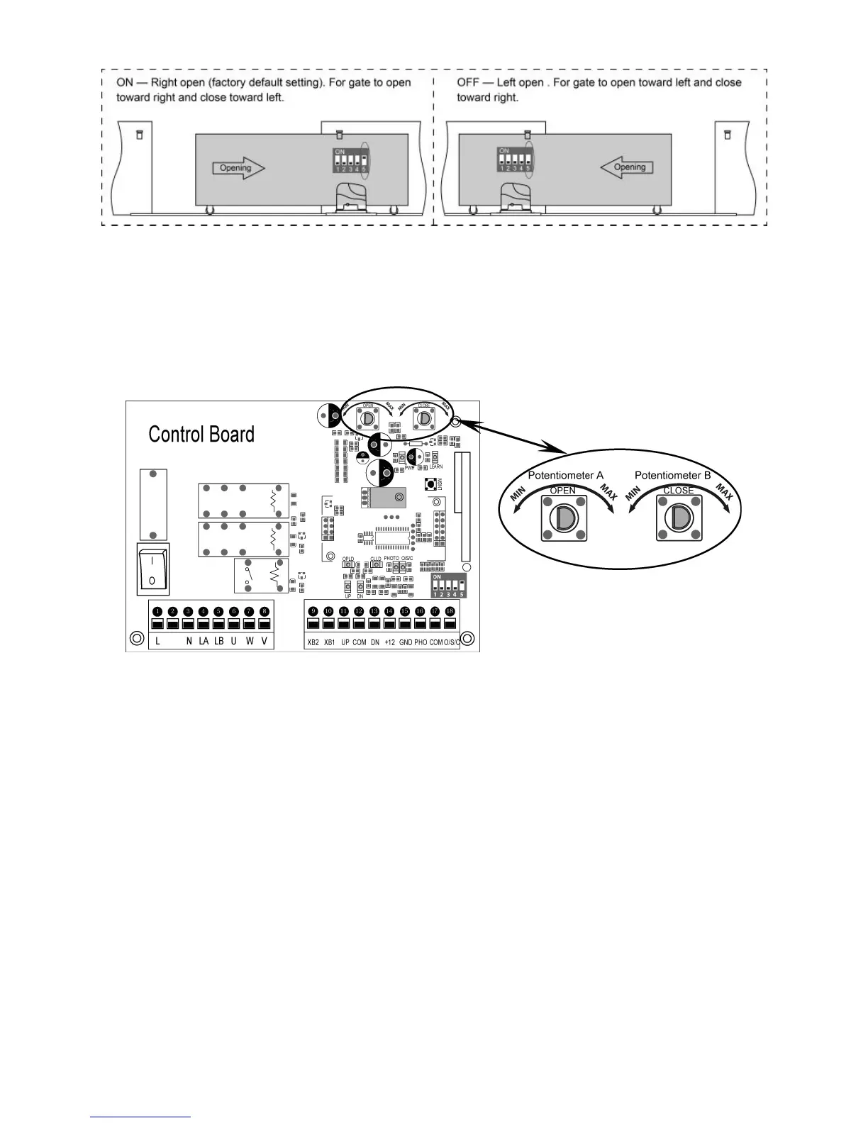 The potentiometer A is to adjust the OPEN stall force of the gate operator. The Potentiometer B is used to