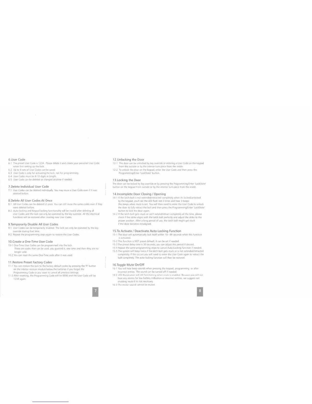 LockState LS-DB500 - Restore Preset Factory Codes; Unlocking the Door; Locking the Door; Toggle Mute On;Off