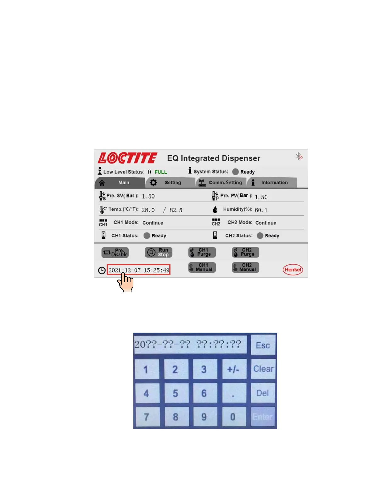 Enter date and time using keypad shown on the screen. Type in digits only, which replace