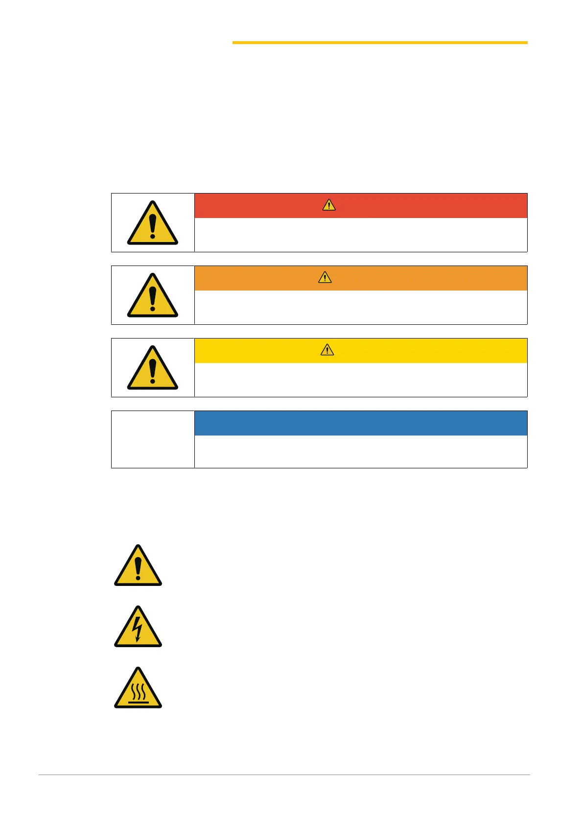 Safety information and warnings draw attention to hazards and are marked with symbols and signal words