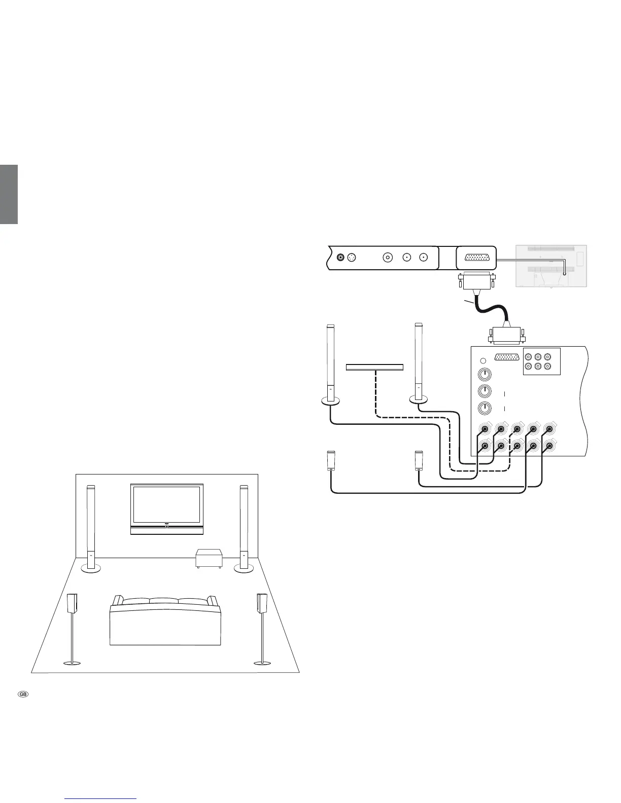 The arrangement of speakers and TV set can look like the illustration