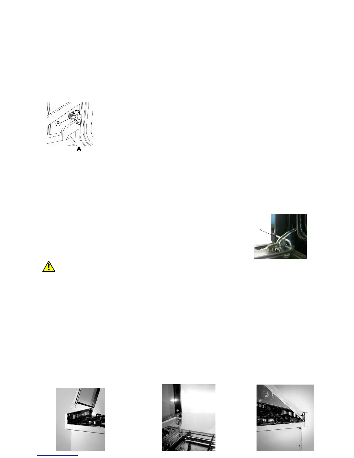 Open the oven door completely, insert the anti-rotation device (A) in the hook of the hinge rods.
