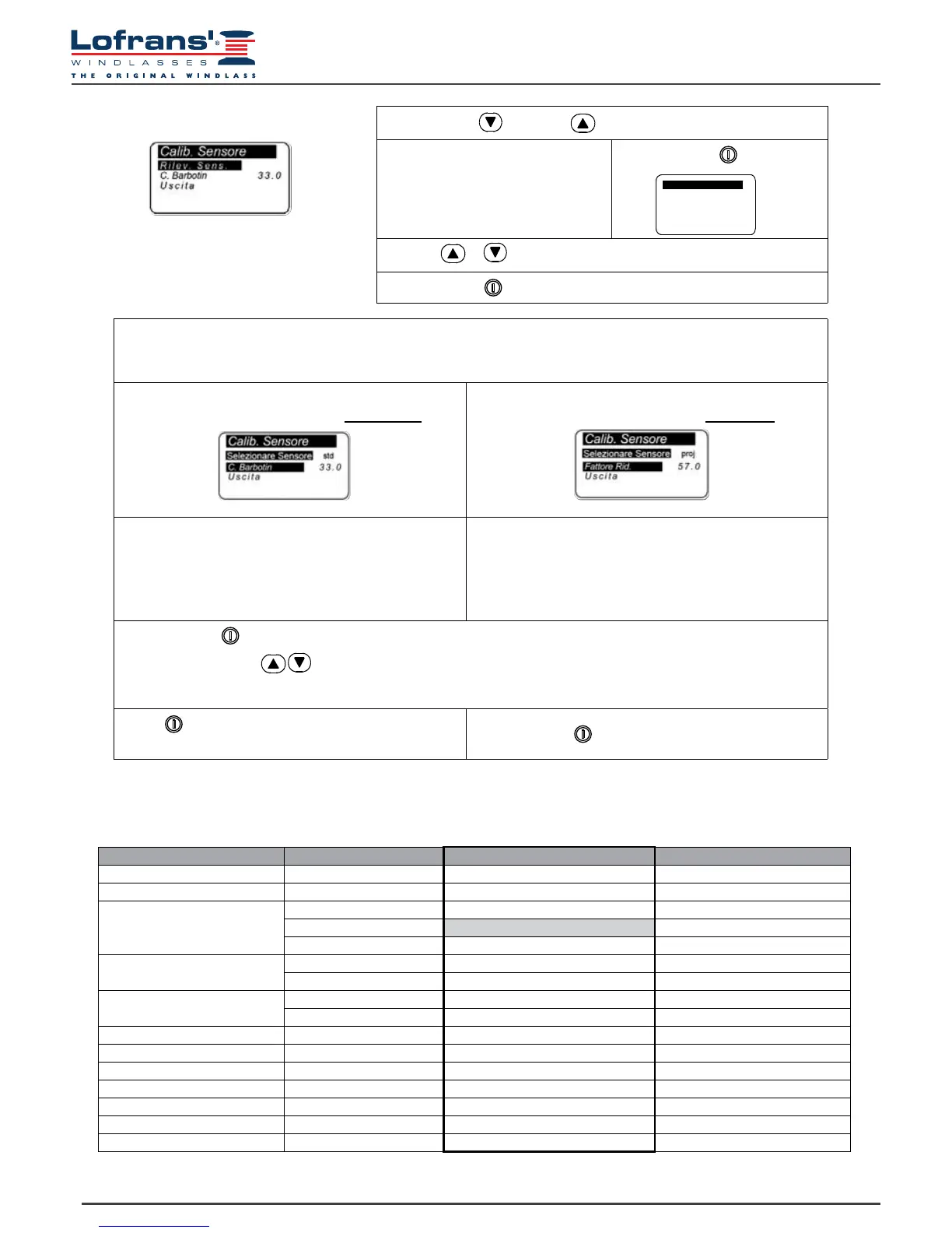 Menù sensore Standard e Project serie X..