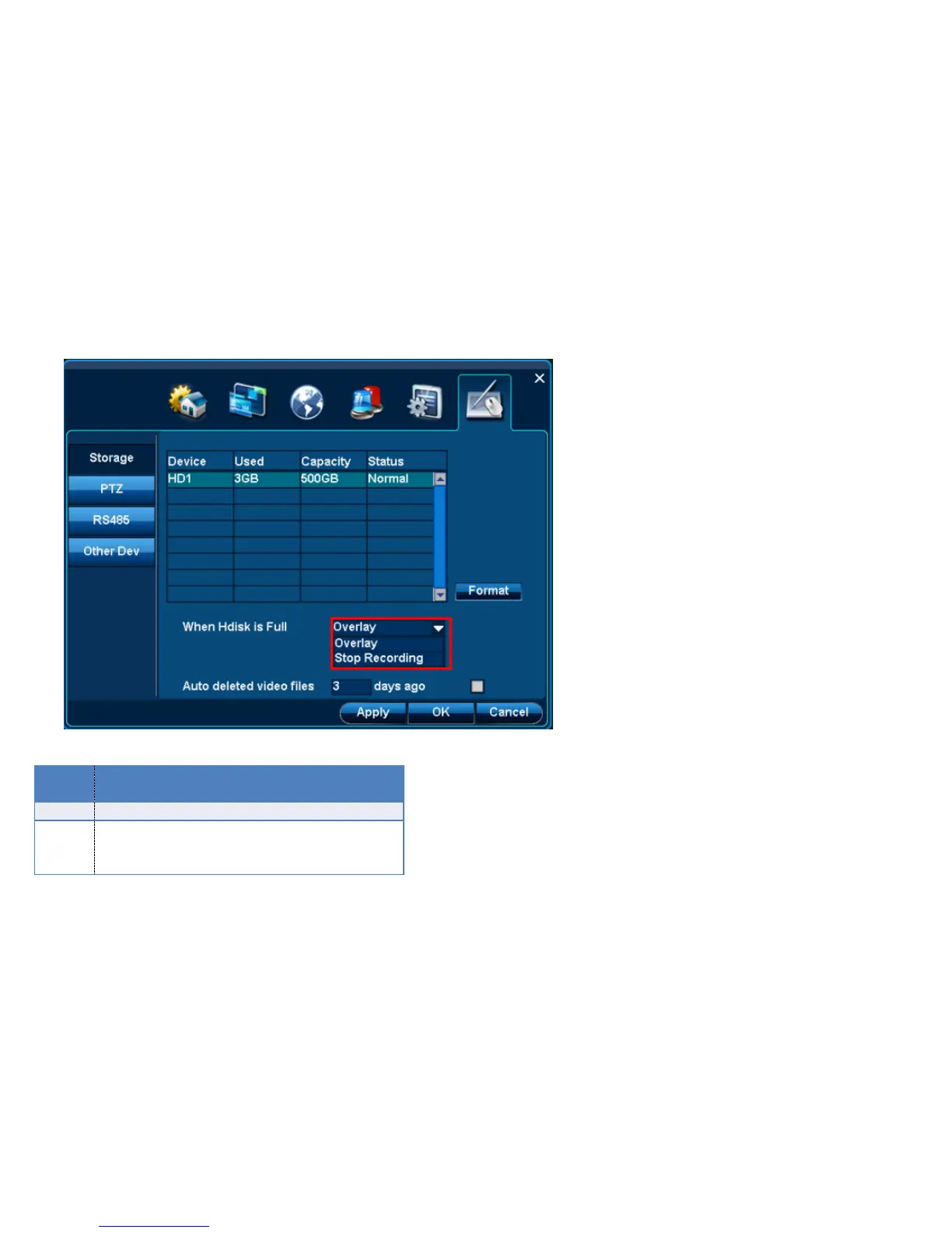 When it is“Hdisk is full”, please select “Overlay”or “Stop Recording”.