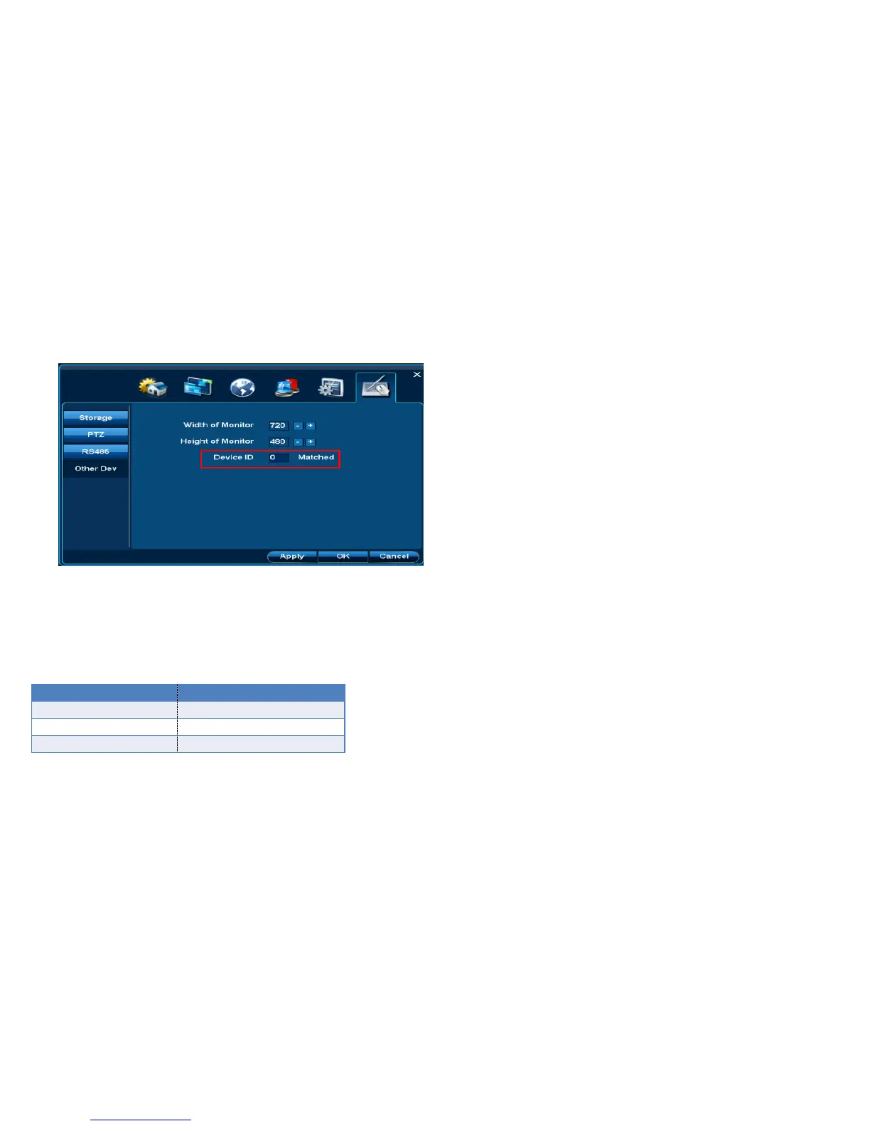 Function:This DVR‟s device ID can be modified at range of 1~255. When the ID is matched with controller, the controller can control this DVR one to one.