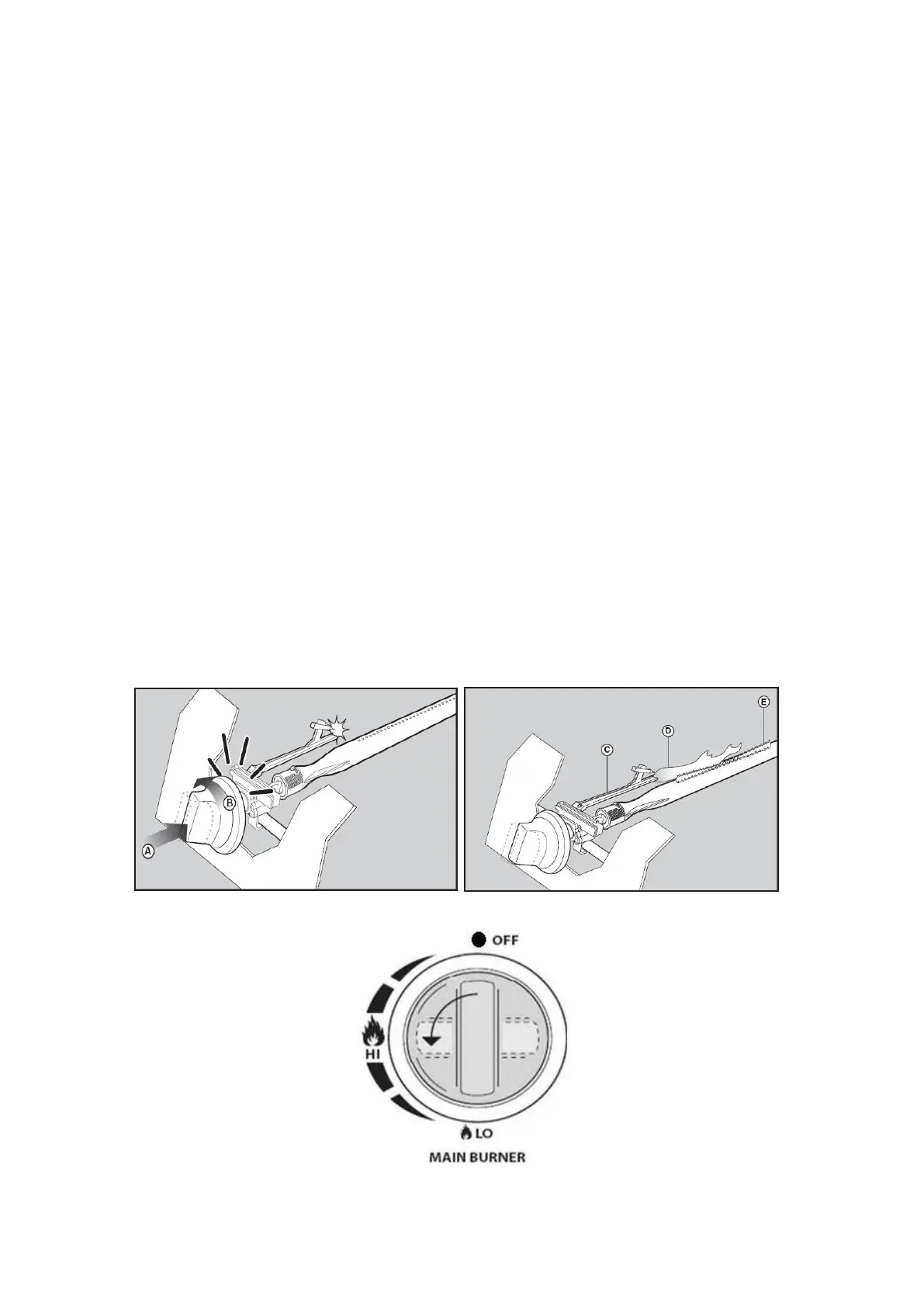 tillåta gas att flöda helt ner i brännarröret (E) och säkerställa tändning.