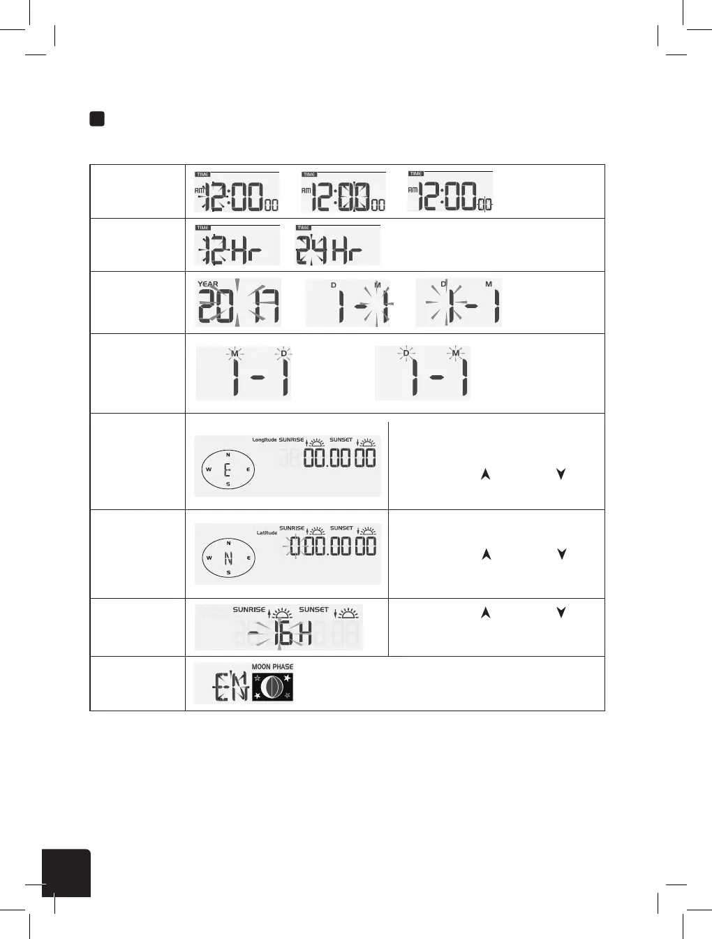 4. The setting sequence: Hour → Minute → Second → 12/24 hour format → Year → Month →
