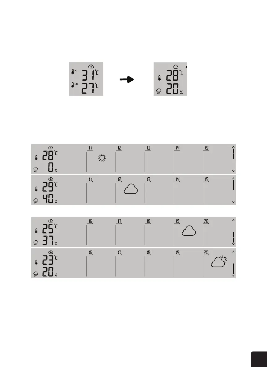 HI/LO temperatures mode and average temperature (AVG) and chance of rain mode.