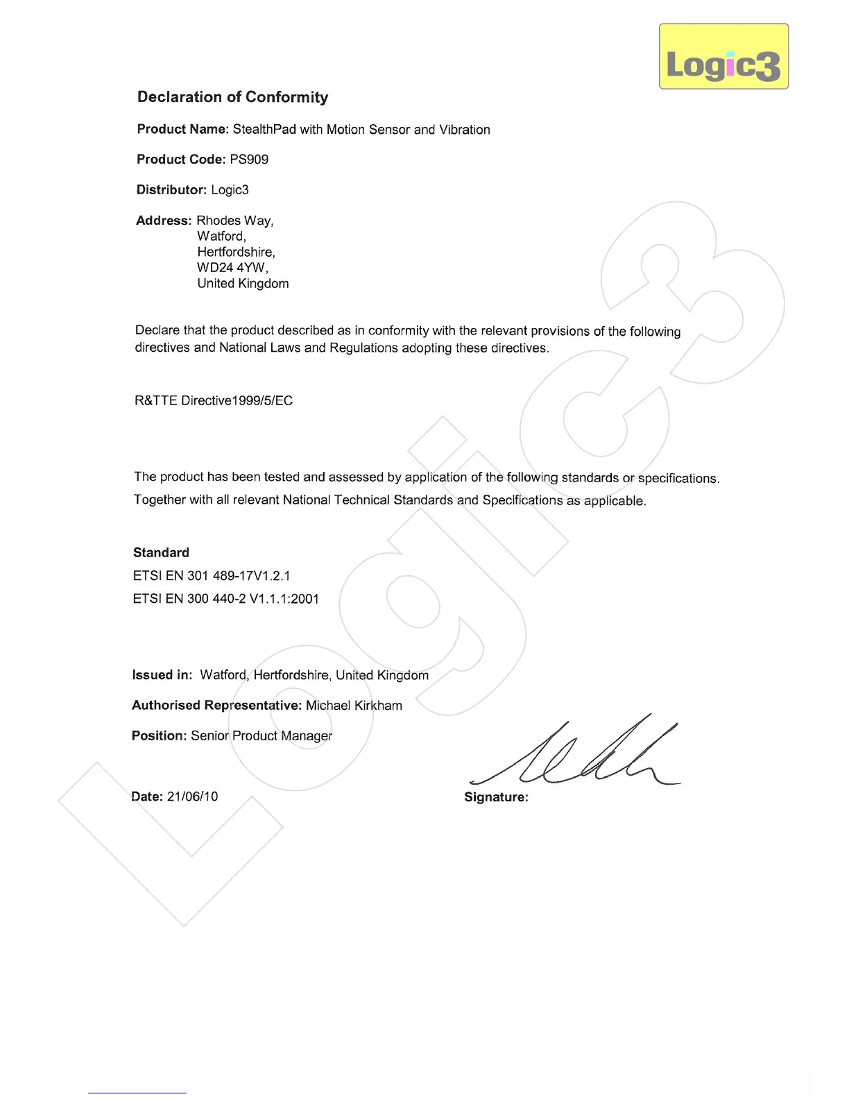 Logic3 Stealth PS909 - Declaration of Conformity