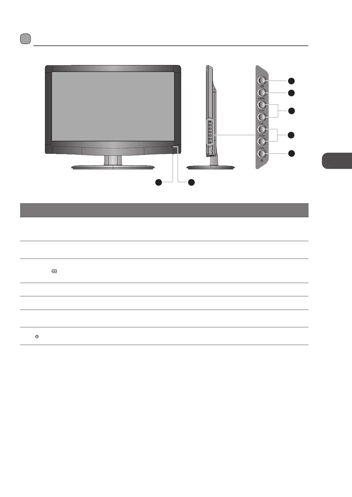 5 CH + / – Press to select a channel or select a sub-menu from the OSD menu.