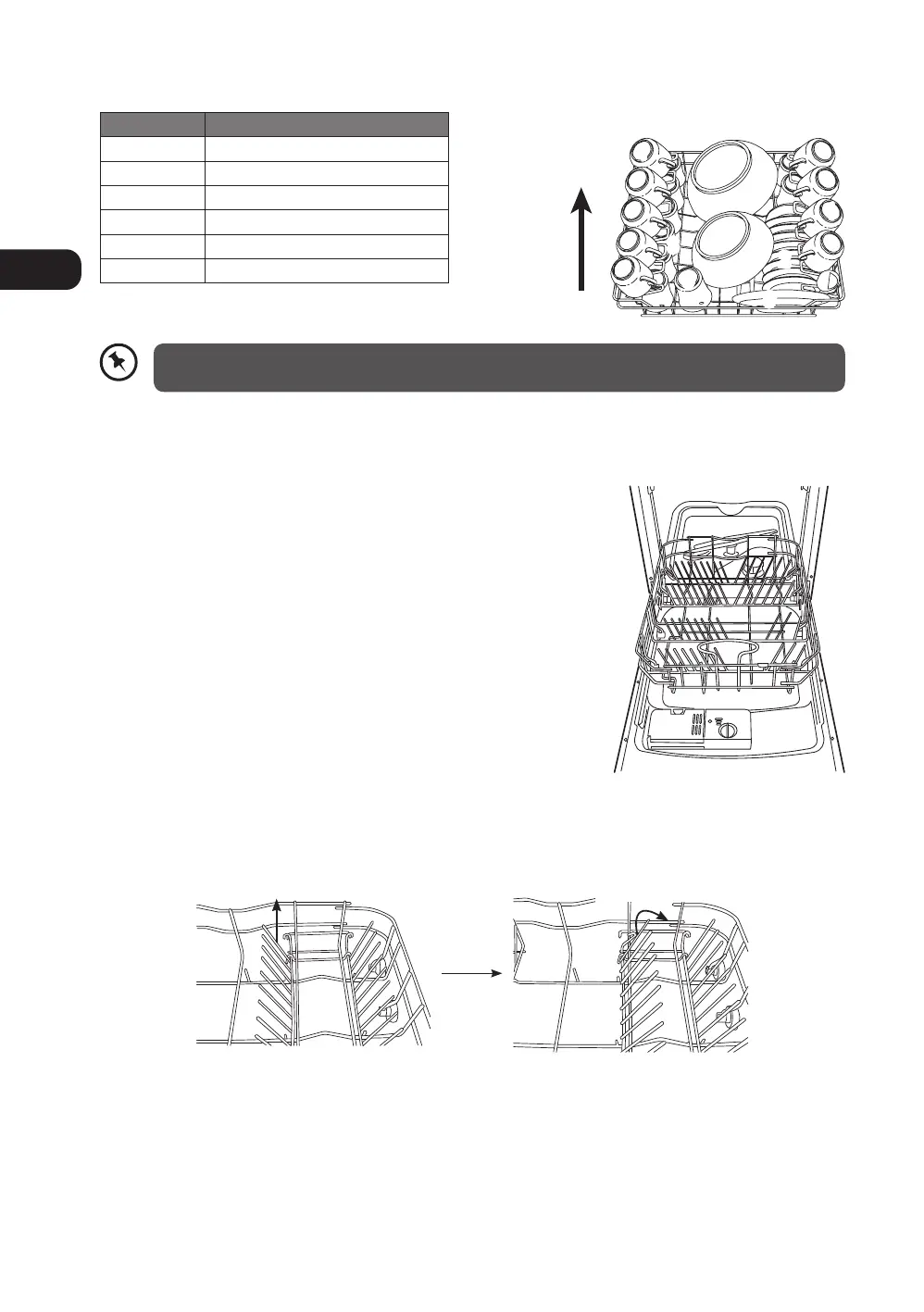 Katso seuraavasta luettelosta ja kuvasta astioiden optimaalinen sijoittaminen yläkoriin.