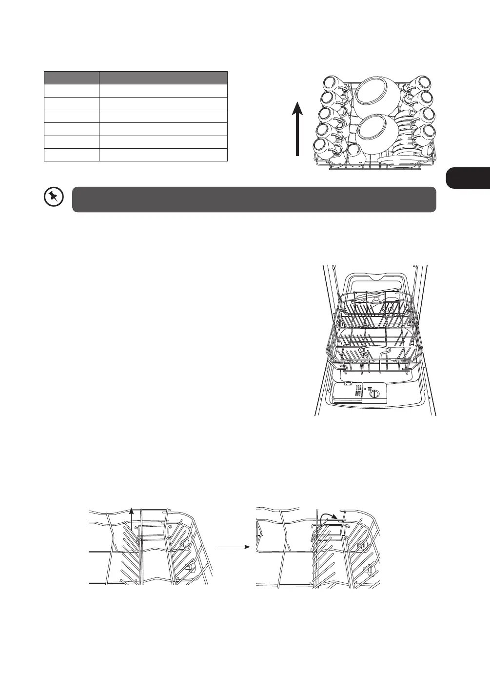 For optimal placering af køkkentøj i den øverste kurv, bedes du venligst se følgende liste samt tilhørende