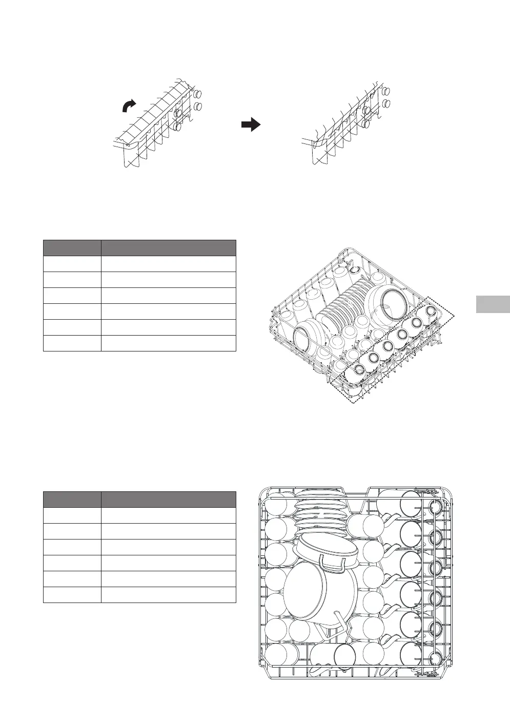 För optimal placering av porslin i den övre korgen, se följande lista och medföljande bild.