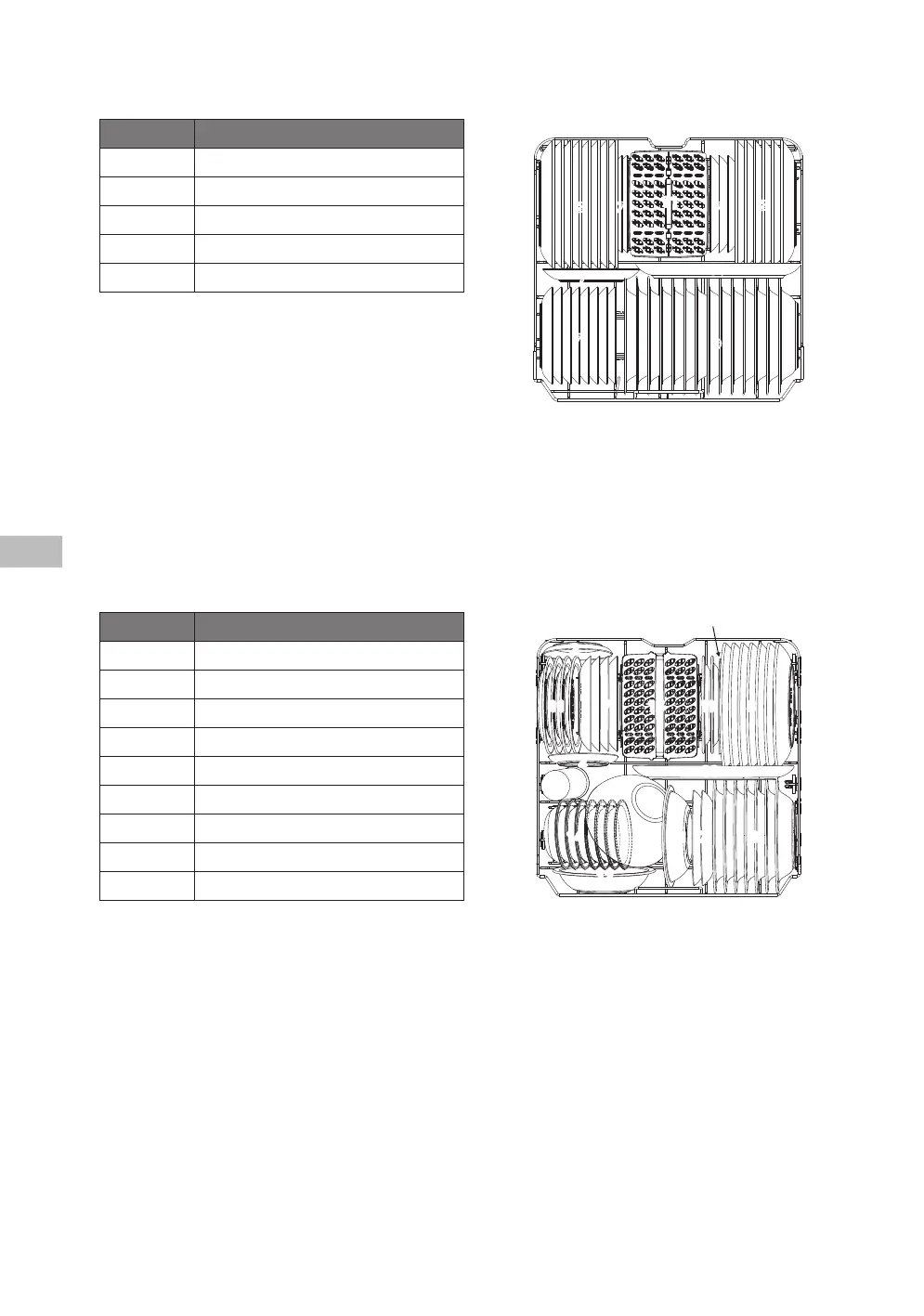 För optimal placering av porslin i den övre korgen, se följande lista och medföljande bild.