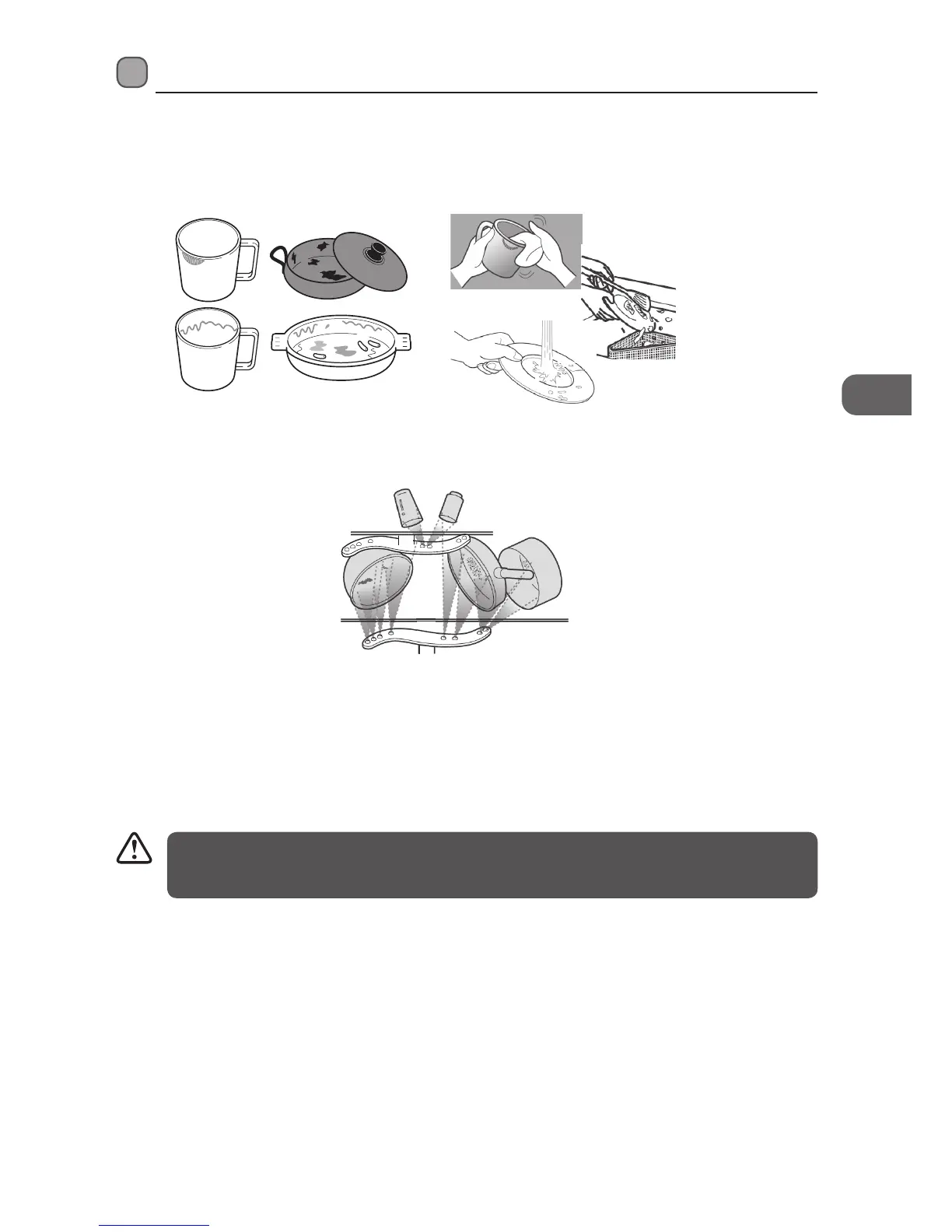 • Hollow items such as cups, glasses, pans, etc. must be placed upside down in the basket.