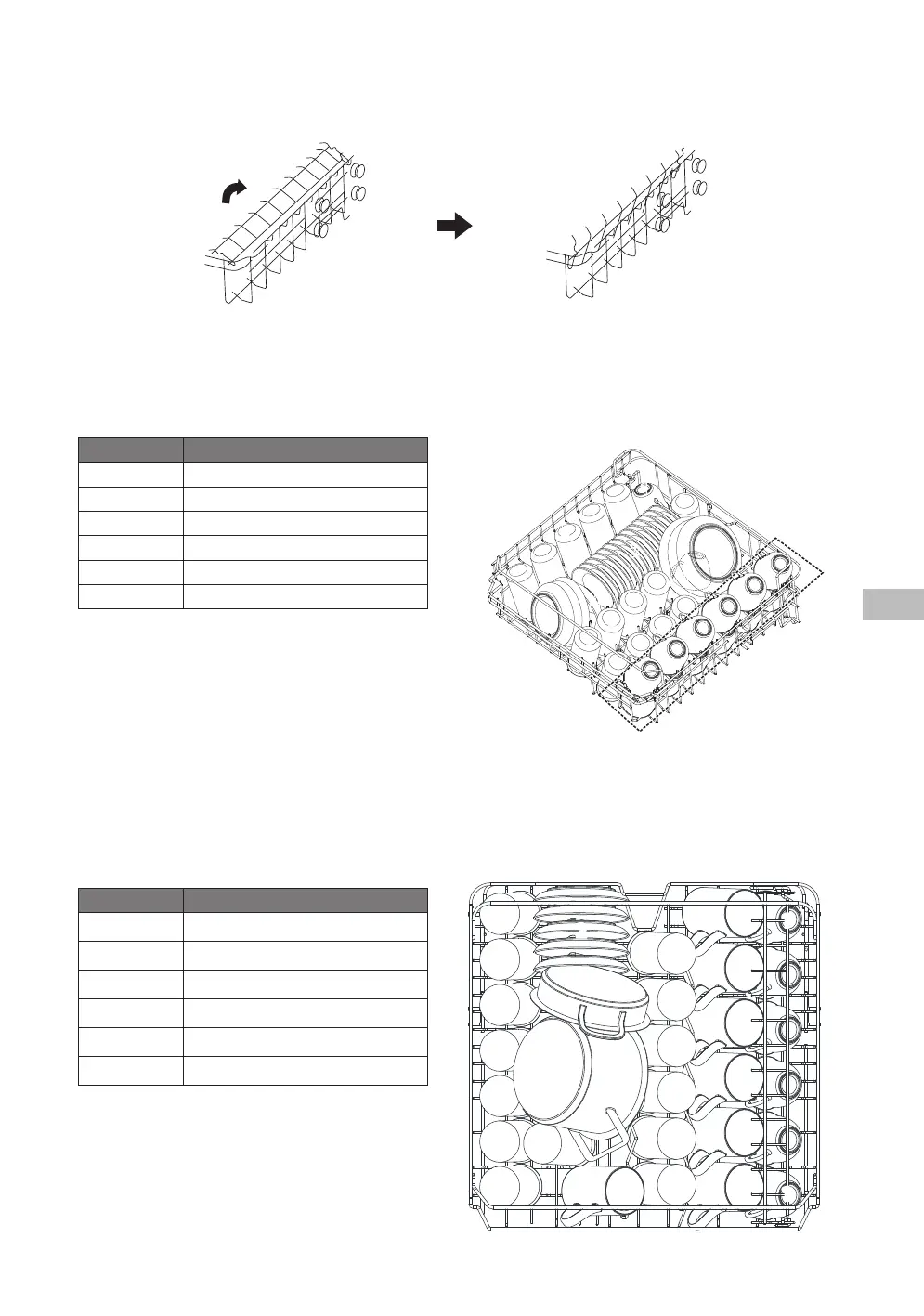 Katso seuraavasta luettelosta ja kuvasta astioiden optimaalinen sijoittaminen yläkoriin.