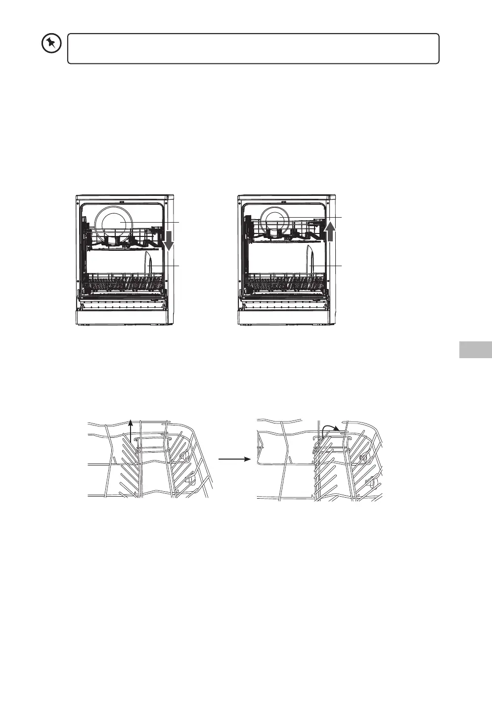 Hvis nødvendigt, skal den øverste kurv skal sættes, så der er plads til større tallerkner enten i den