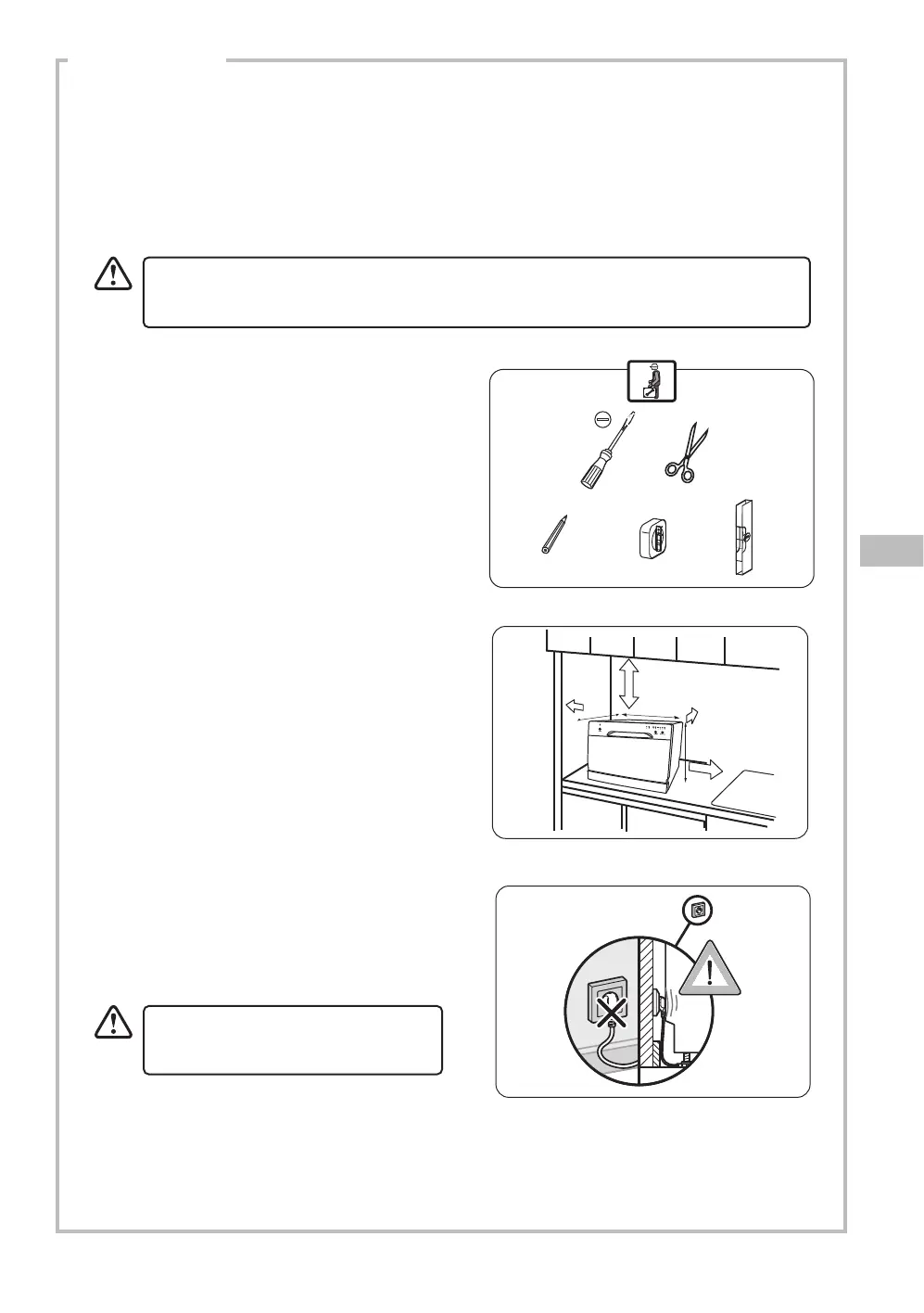 Täck inte över diskmaskinen. När den installeras, se till att det nns fritt utrymme kvar på sidorna.
