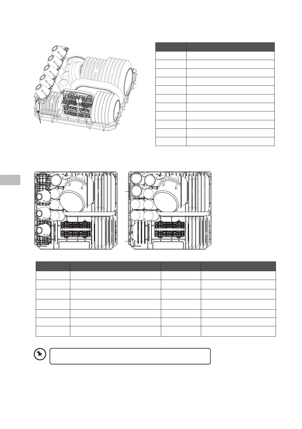 För optimal placering av porslin i den övre korgen, se följande lista och medföljande bild.