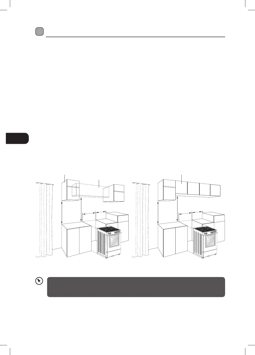 • Spisen kan placeras i ett kök, kök/matrum eller sov-vardagsrum, men inte rum med bad eller dusch.