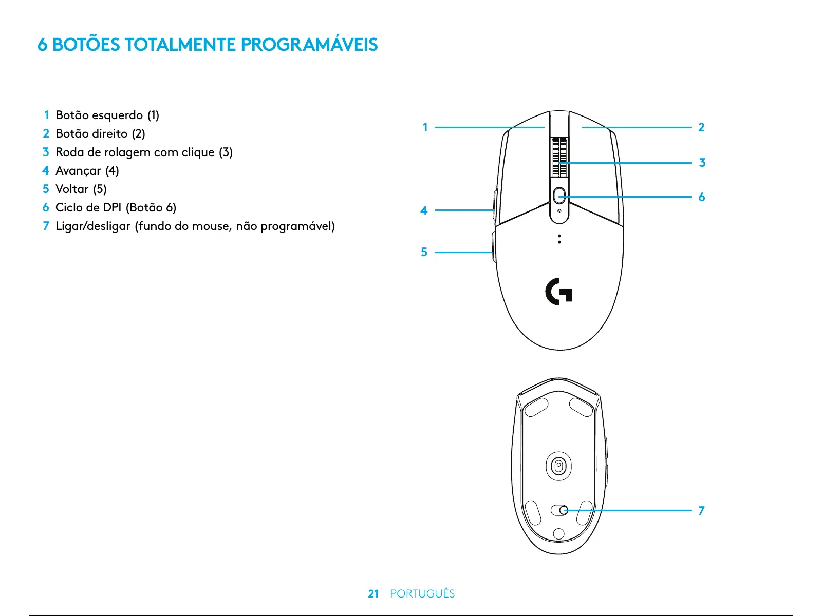 7 Ligar/desligar (fundo do mouse, não programável)