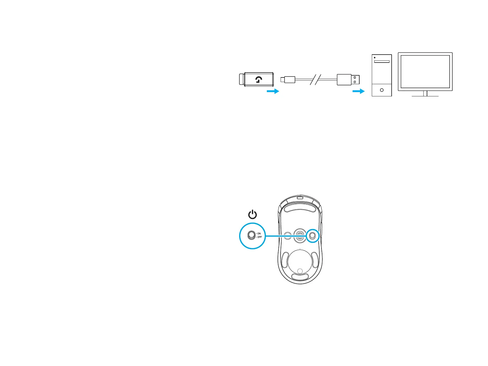 la PC, iar celălalt capăt la adaptorul și receptorul USB.