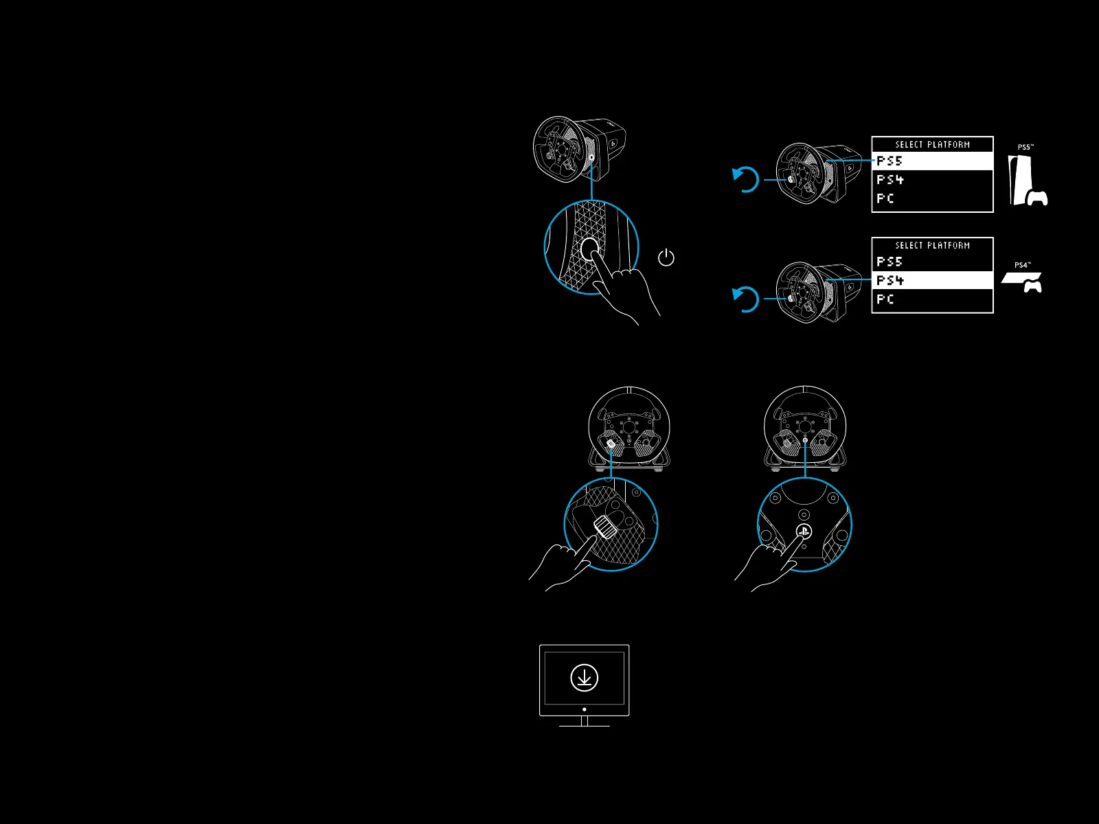 4 Pressione o botão PS para fazer login e sincronizar o volante