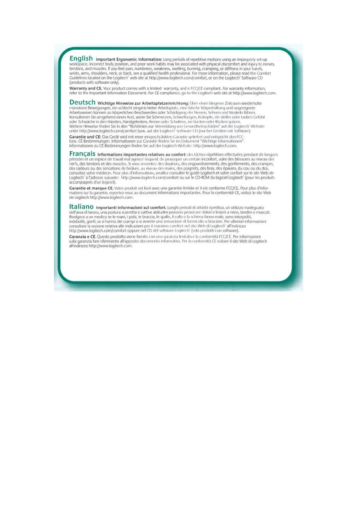 Logitech C-U0001 - Ergonomic and Comfort Guidelines; Product Warranty and Compliance