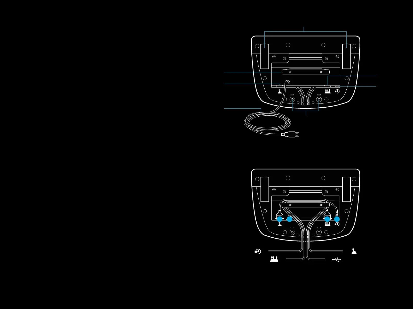 USB ve pedal kabloları (1, 2) ç kanallardan geçrlmeldr.