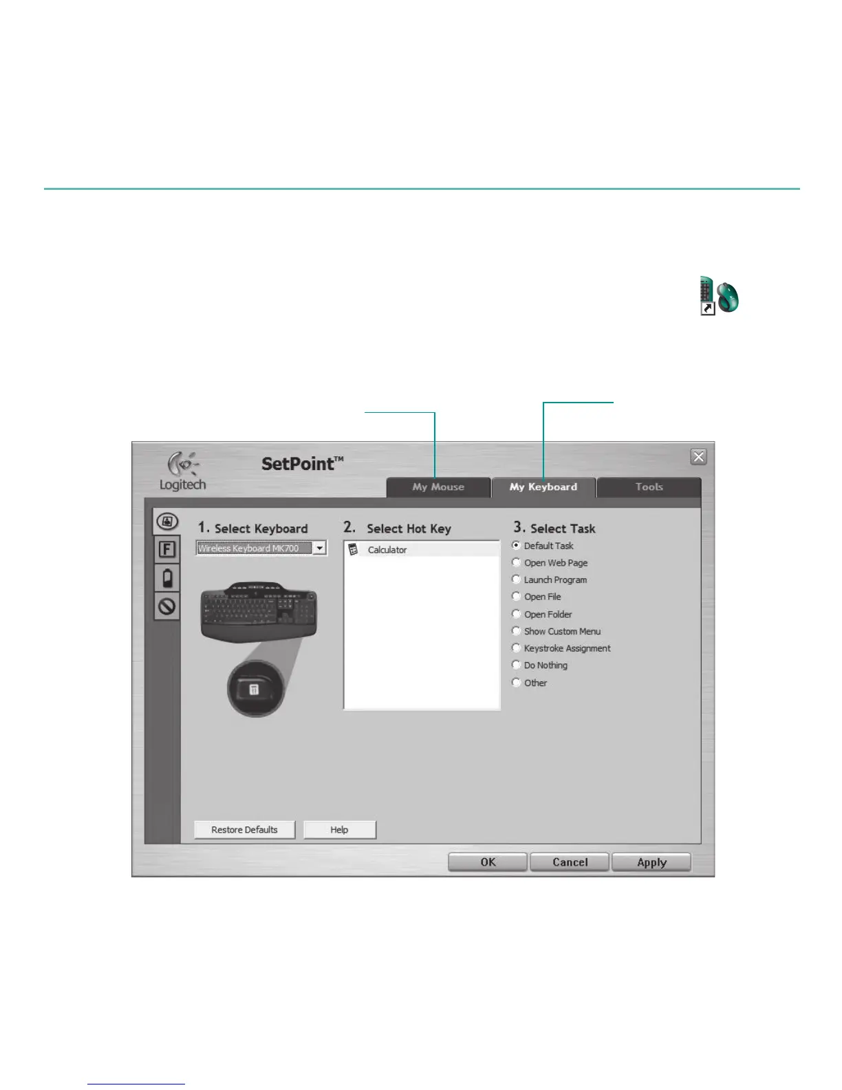 To customize the keyboard, click the My Keyboard tab. For the mouse, click the My Mouse tab.