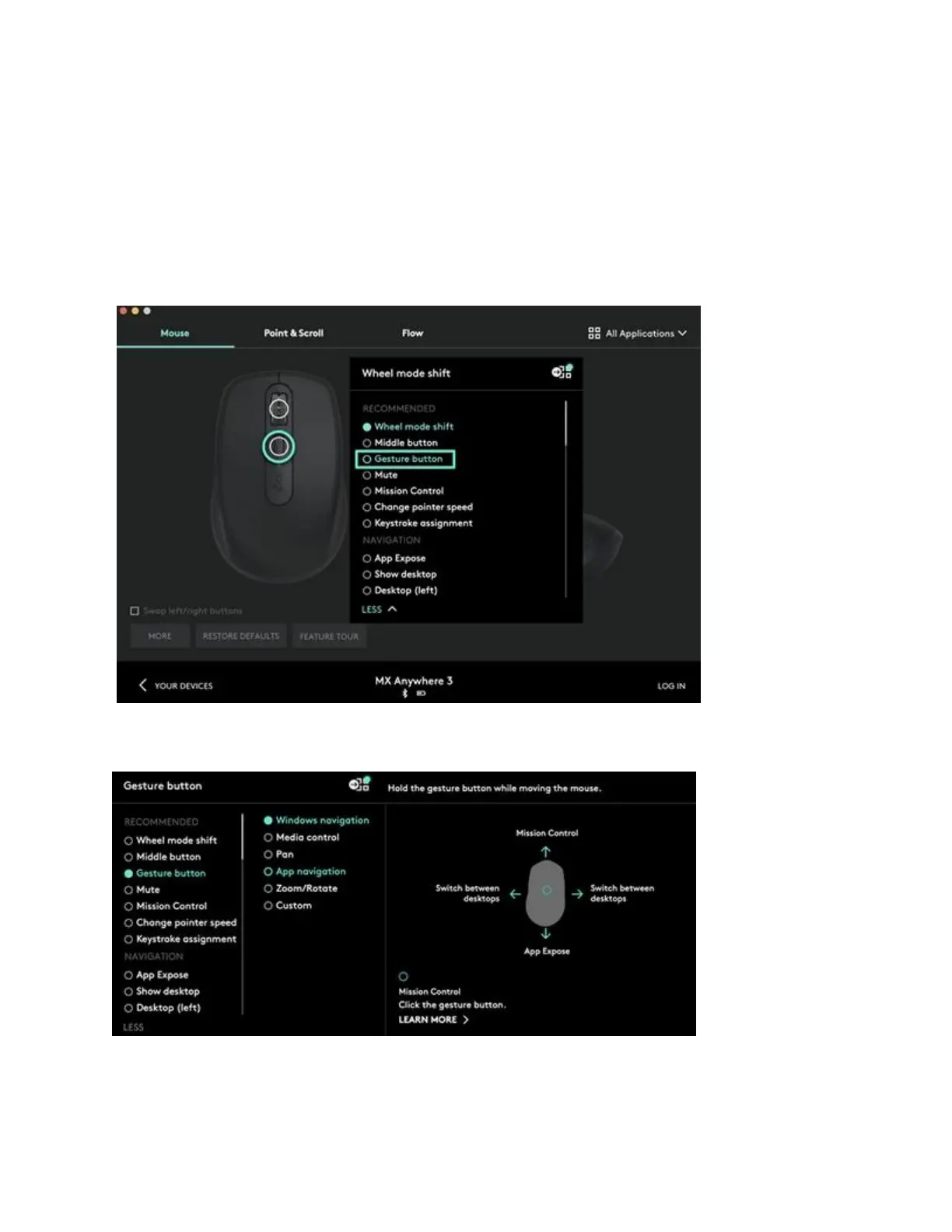 On the Mouse tab, select the top button below the wheel and click on Gesture Button.