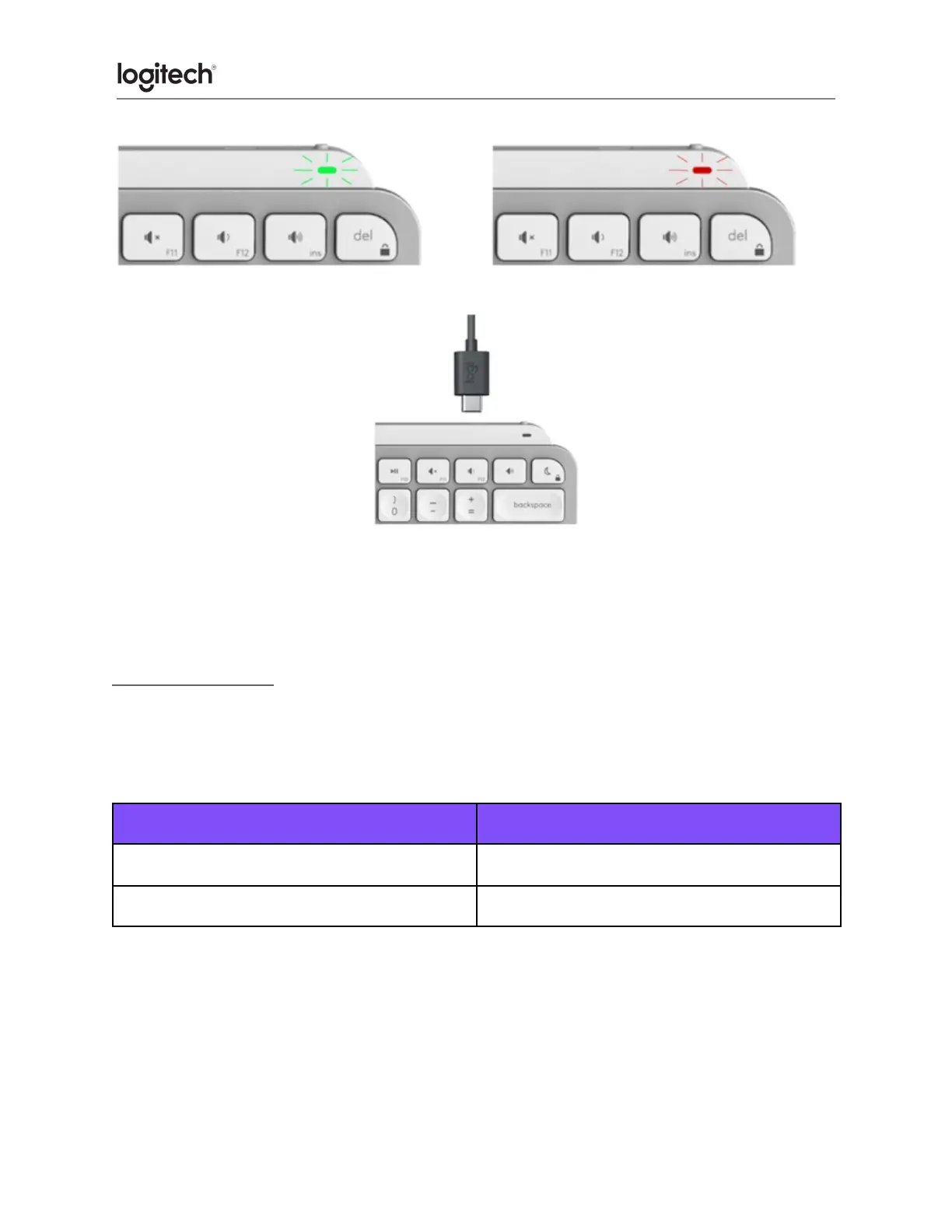 To charge, plug in the USB-C cable at the top right corner of your keyboard. You can continue