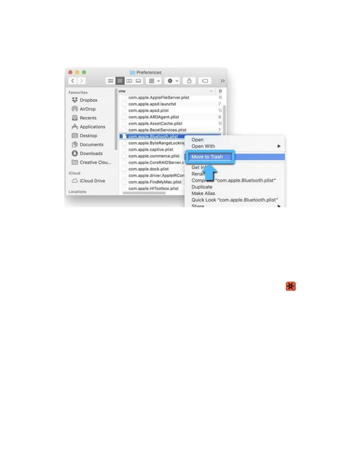 click the com.apple.Bluetooth.plist file and select Move to Trash from the pop-up menu.