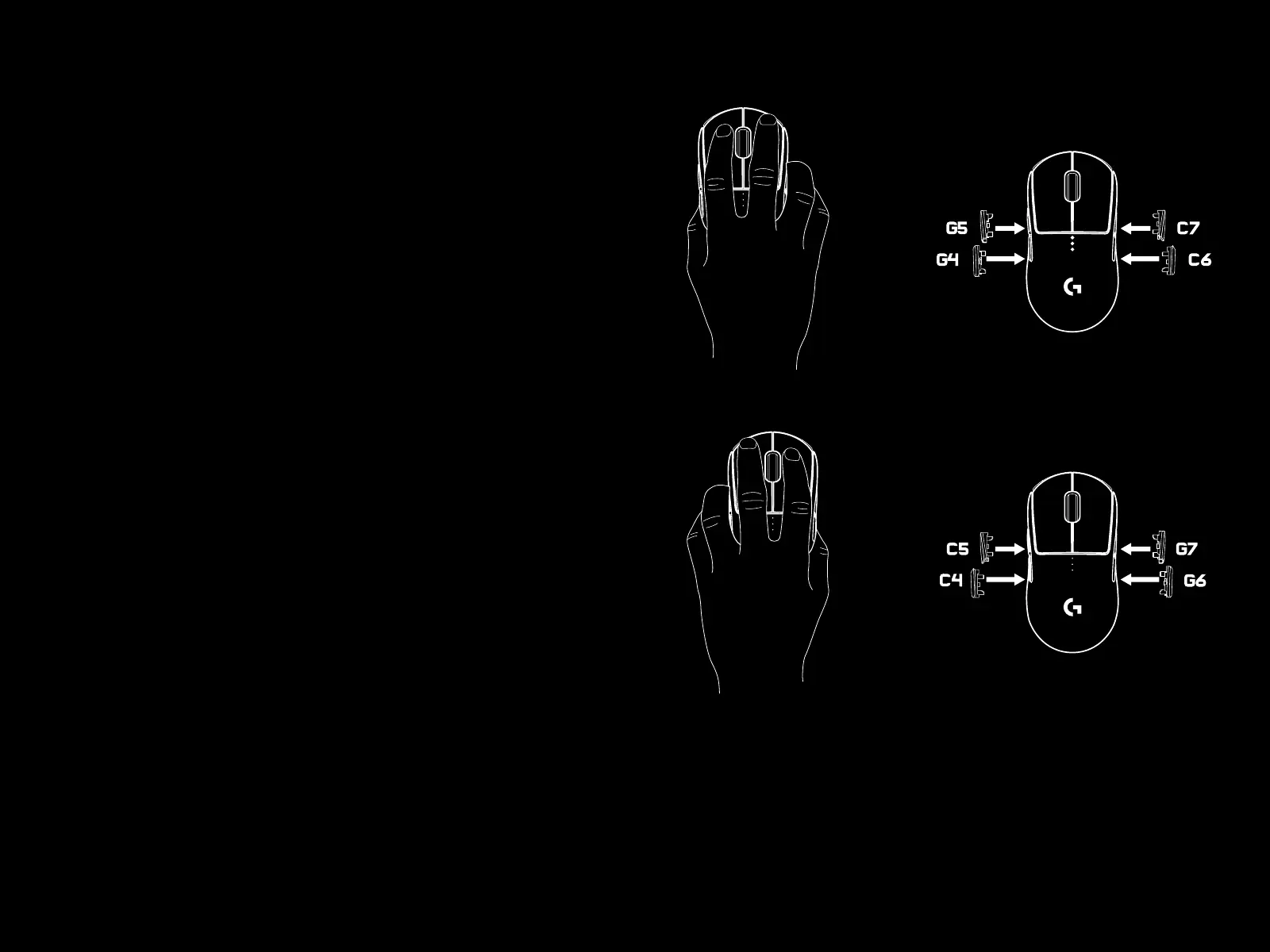 Logitech PRO WIRELESS - Button Customization Options; Right-Handed Button Configuration; Left-Handed Button Configuration; Buttonless Configuration Mode