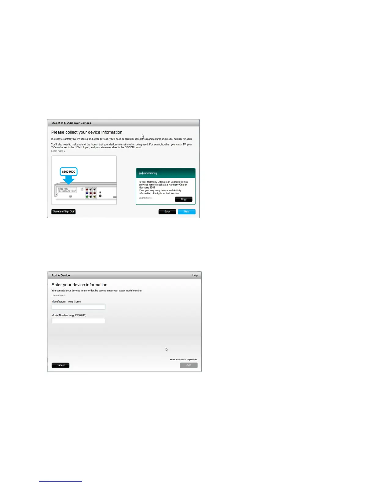 Carefully enter the manufacturer or brand of your first device followed by the model number. Harmony will