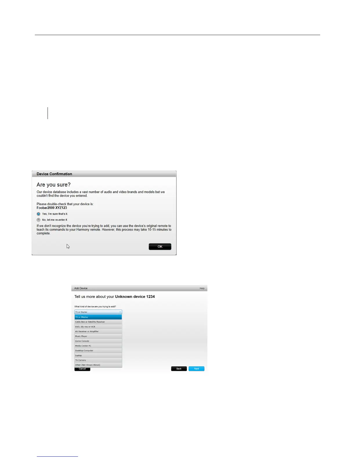 1. If MyHarmony is unable to find your device you will be prompted to double check the information