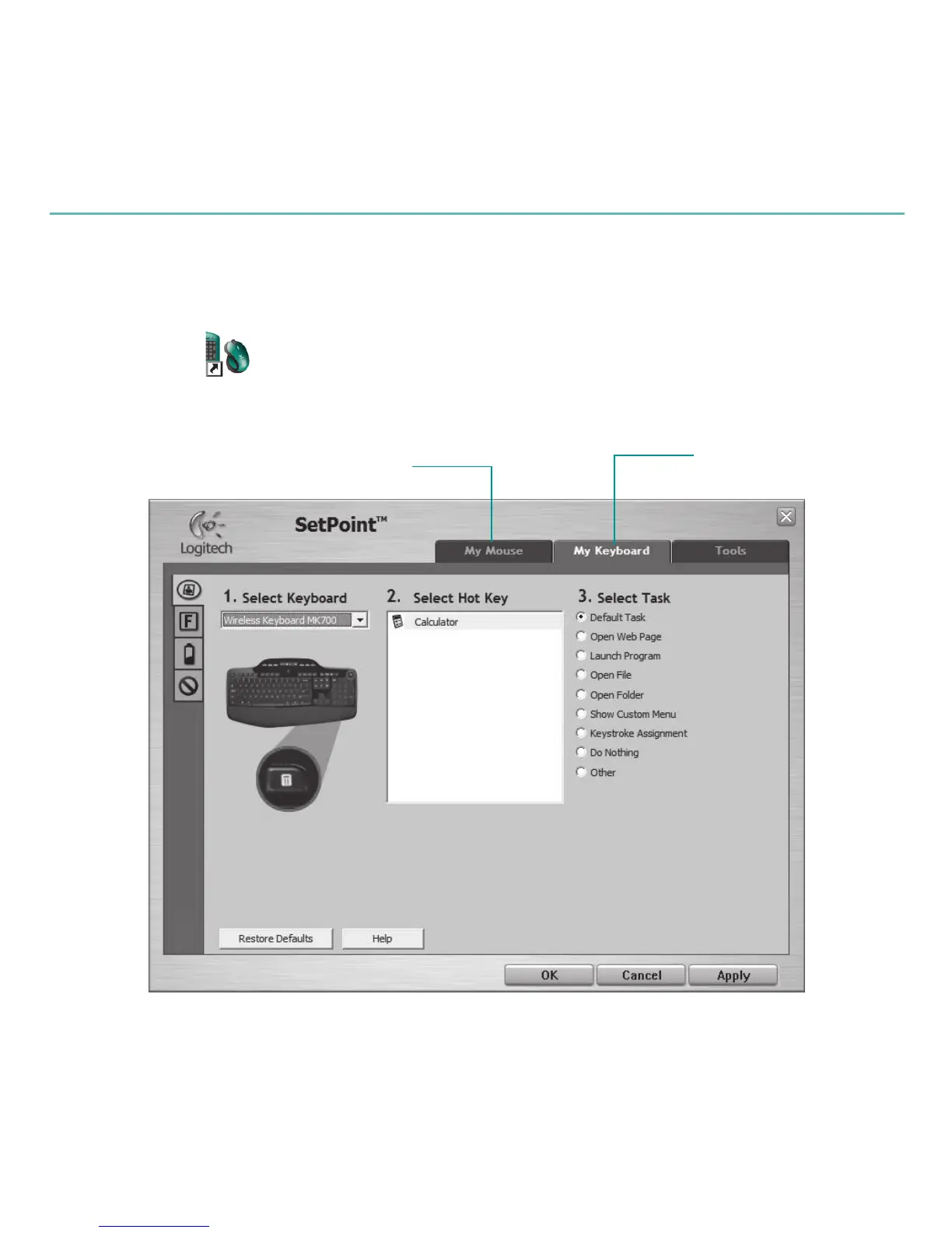 Para personalizar o teclado, clique na guia Meu teclado. Para o mouse, clique na guia 2.