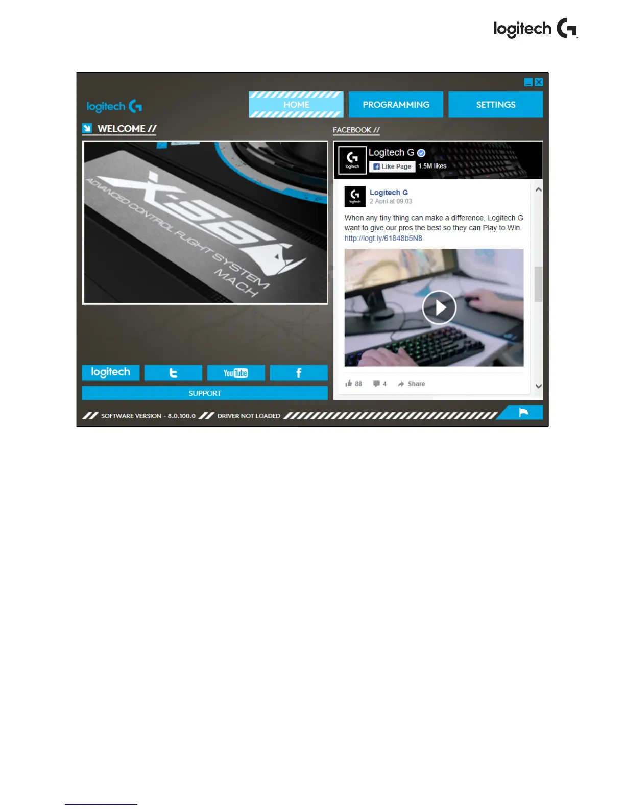 - Accesos directos a redes sociales y sitios Web, LogitechG.com, Twitter, YouTube,