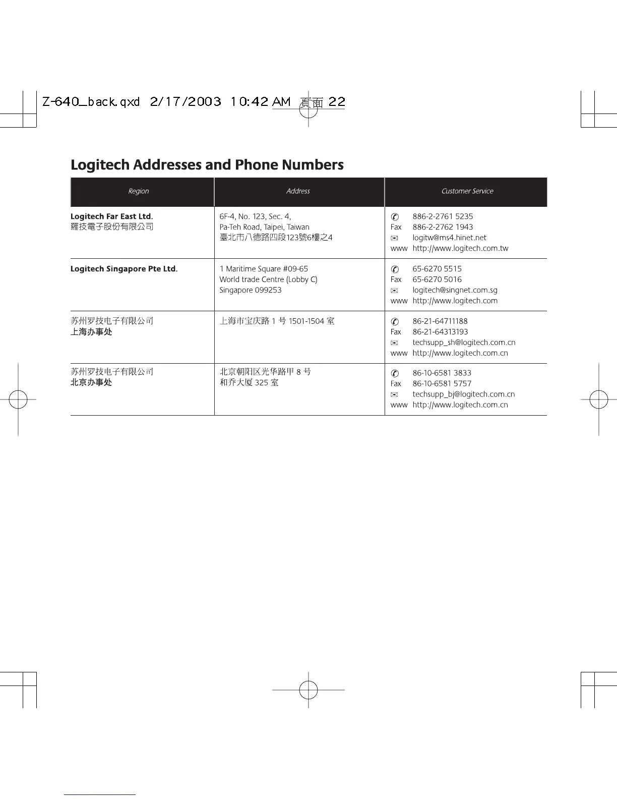 Logitech Z-640 - Logitech Addresses and Phone Numbers