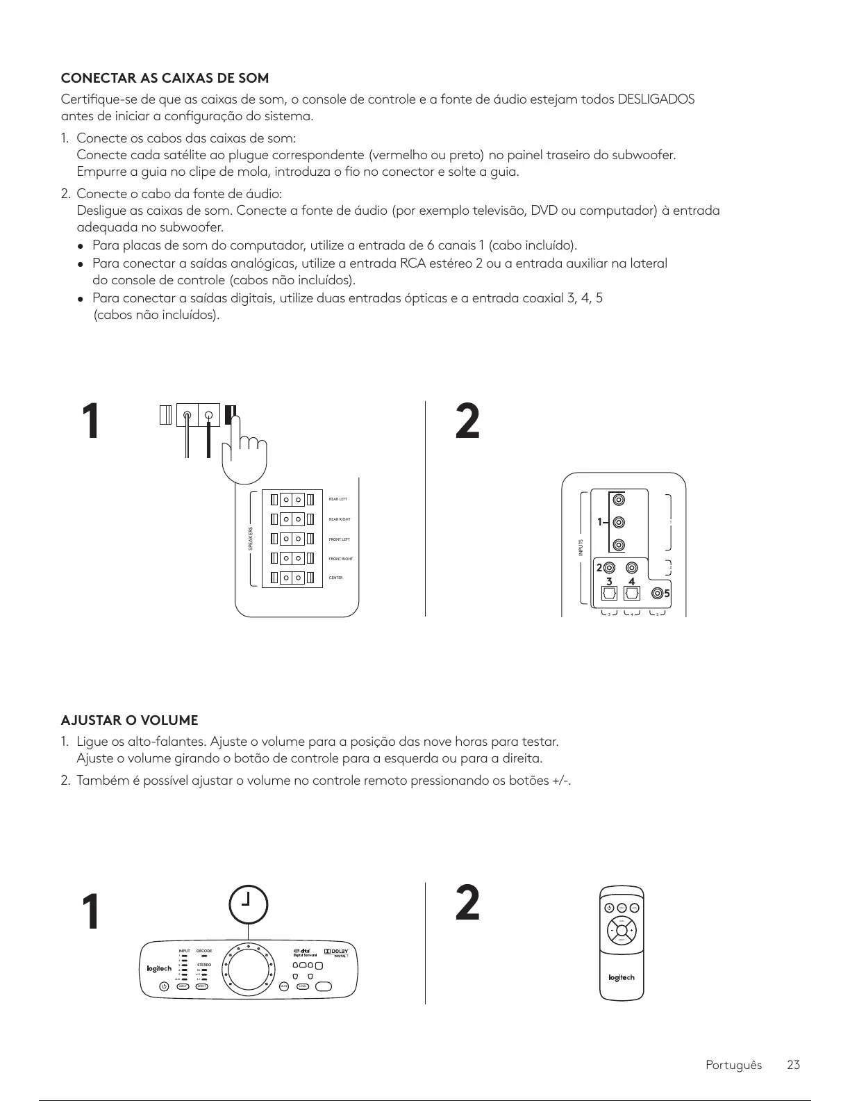 1. Ligue os alto-falantes. Ajuste o volume para a posição das nove horas para testar.