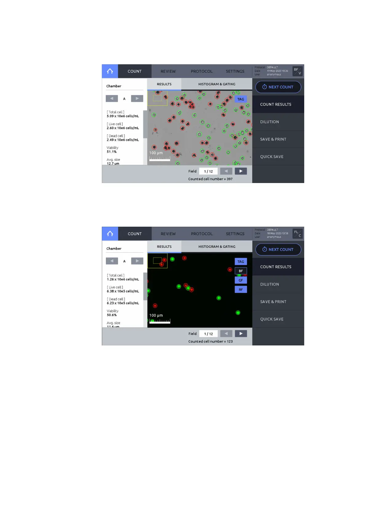 After fluorescence cell counting, BF, GF, and RF images can be viewed separately or in