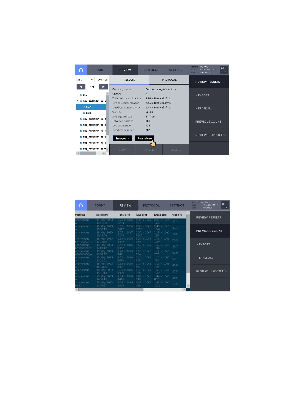 A summarized version of each count that includes User/File, Date/Time, Total cell c on centration,
