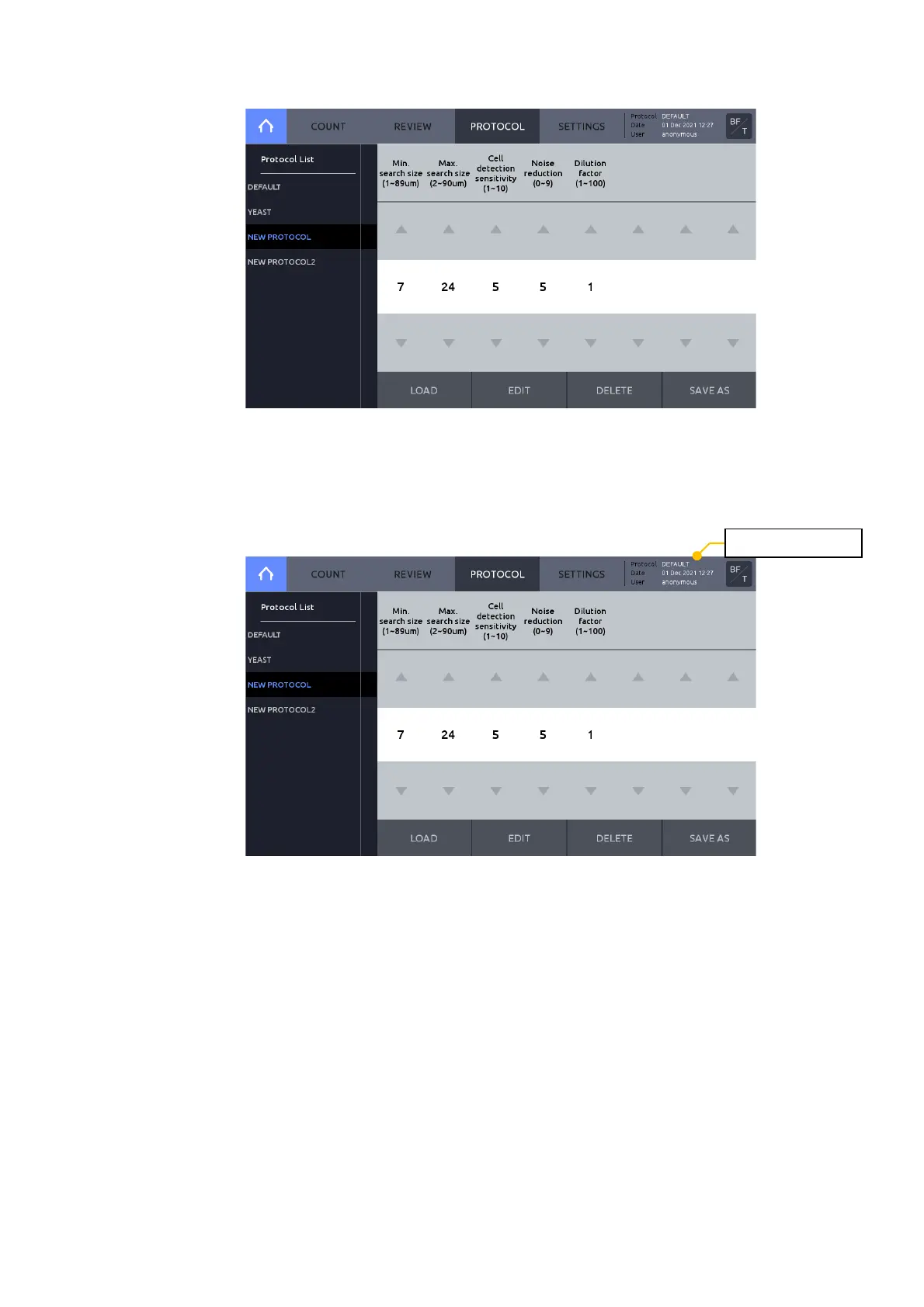 Press LOAD to save the edited protocol under the selected name and activate it.