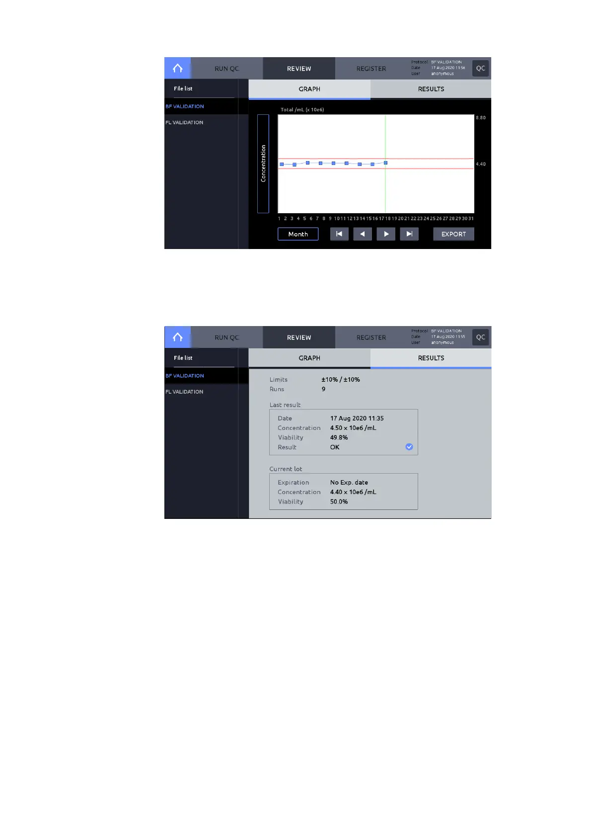 ‘Concentration’ and ‘Viability’. Press ‘Day’, ‘Month’ or ‘Year’ to alter X-axis scale.