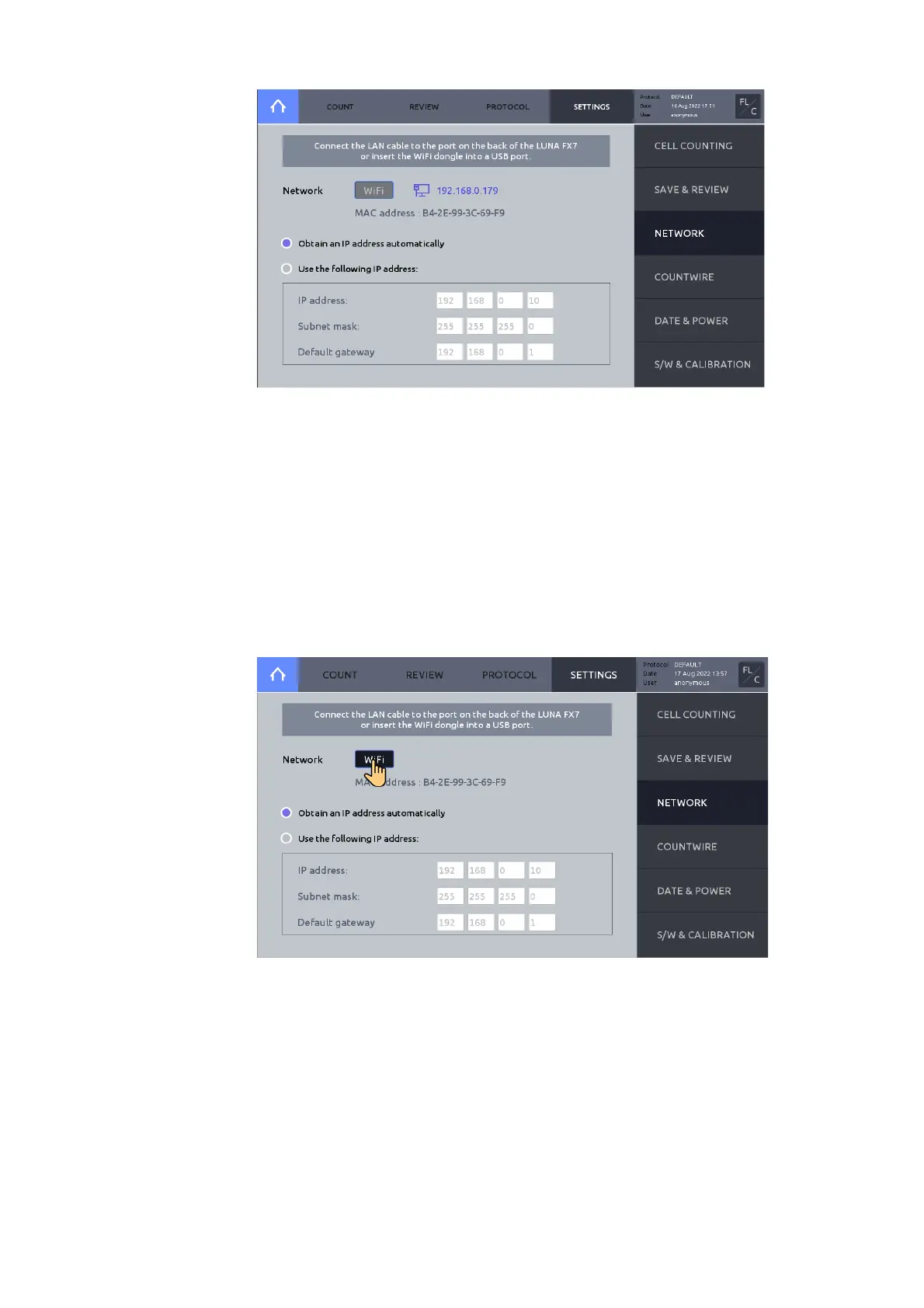 Insert the supplied WiFi dongle to a LUNA-FX7™ USB port.