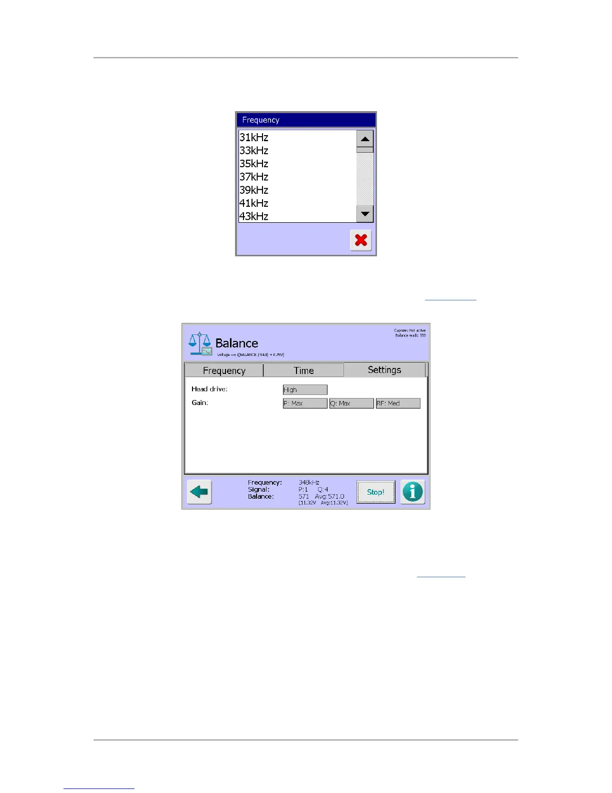 Tapping on the Settings tab displays the currently set Head drive, P gain, Q gain and RF gain